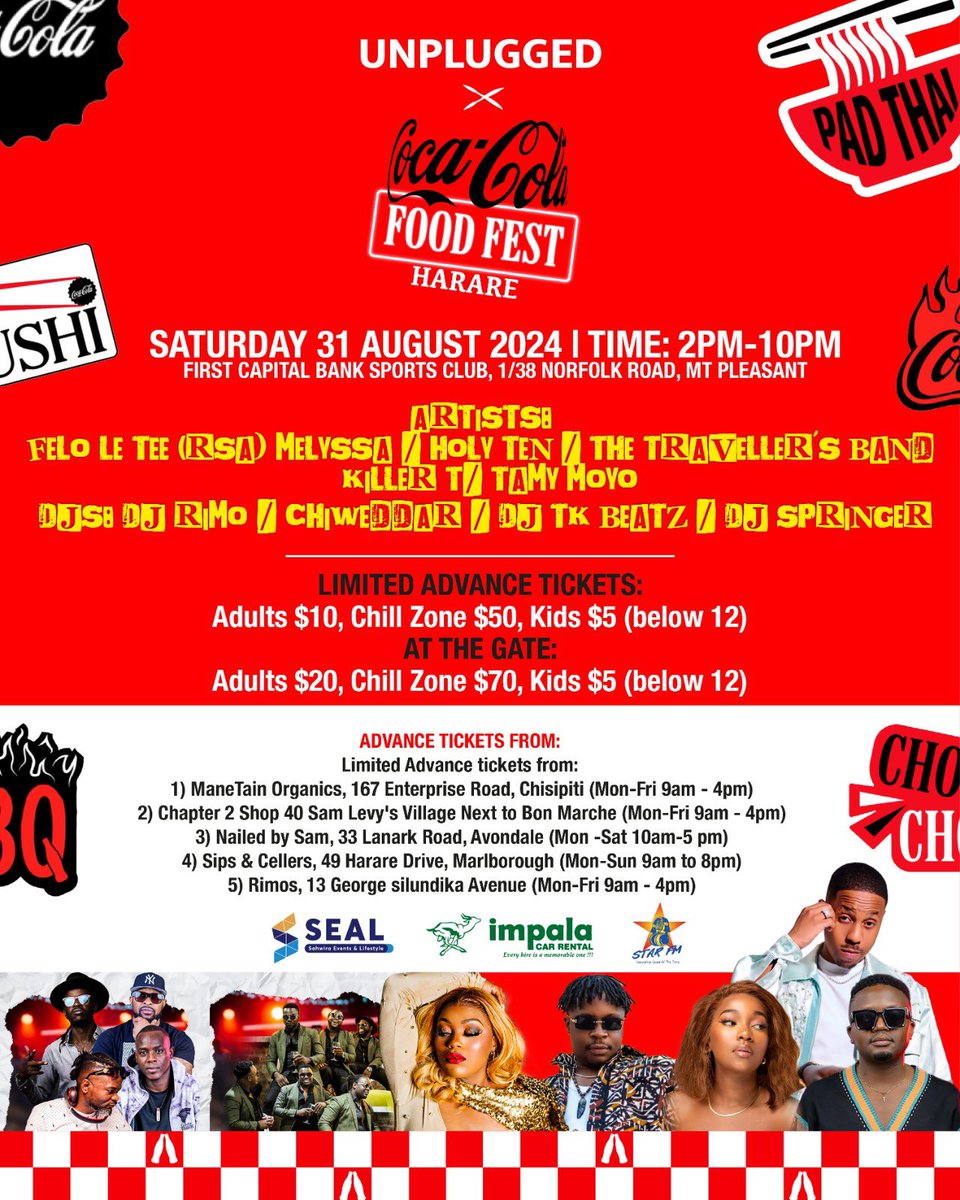Coca-Cola and Unplugged are set to deliver an unforgettable experience with the August edition of Unplugged X Coca-Cola Food Fest, happening this Saturday, August 31, 2024, at First Capital Sports Club, Harare.